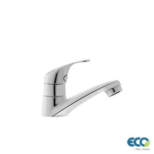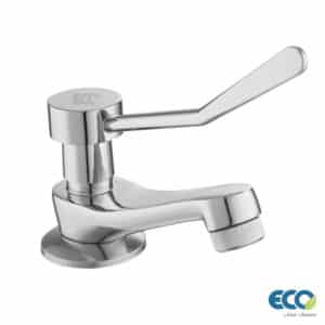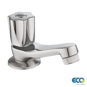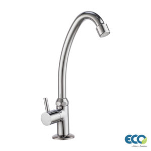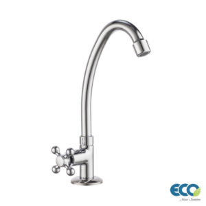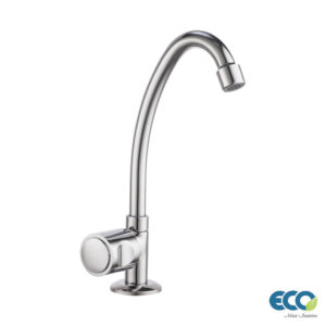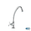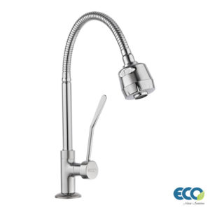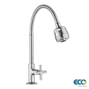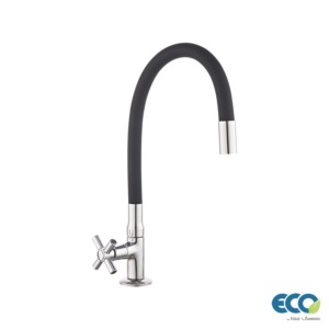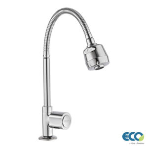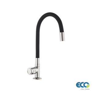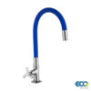TORNEIRA ÁGUA FRIA, MODELO REDONDO DE MESA, MANOPLA C-34, BICA ARTICULÁVEL DE SILICONE VERMELHA.